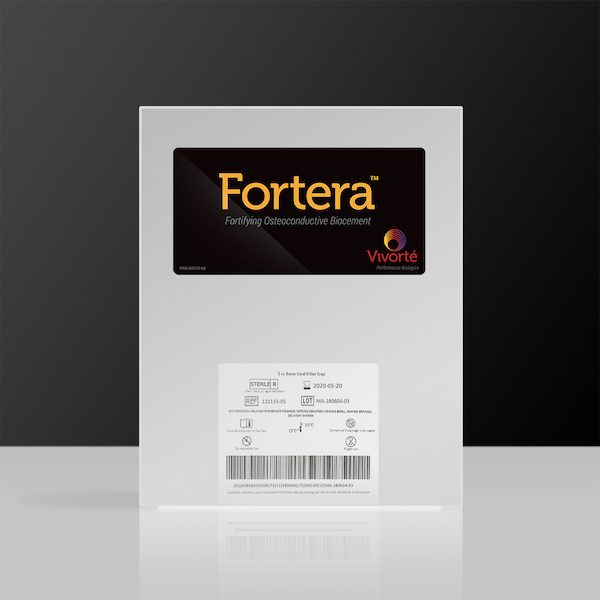 Fortera is a proprietary, self-setting, injectable calcium phosphate cement. Upon mixing, the material transforms into a paste, capable of flowing through a 16-gauge cannula. Fortera is ideally suited for bone void filling applications requiring high compressive strength and circumstances requiring controlled or minimally invasive delivery.