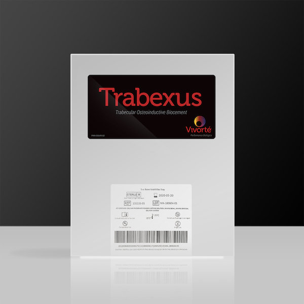 Trabexus is a proprietary, self-setting, gradually resorbable, calcium phosphate cement combined with engineered allograft particles. This novel formulation optimizes the material's remodeling characteristics and compressive strength. The product is intended for indications where remodeling is important.